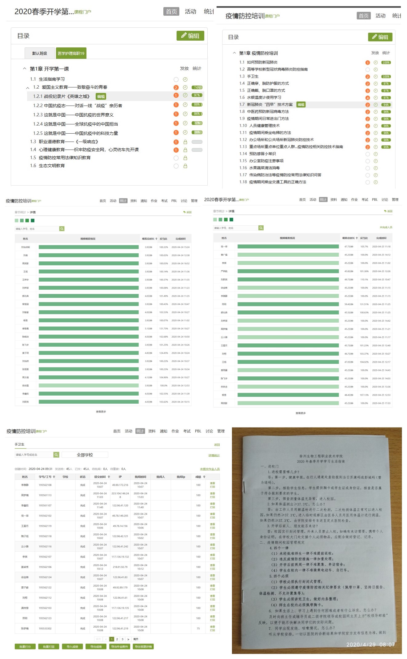 4月23日入学报到后,班主任通过线上会议的形式,布置了学生入学后的相关安排,强调了学生在校规校纪、个人防疫、在线教学、公寓管理等方面的注意事项,之后对入学教育安排进行了部署,拉开了入学教育的序幕。此次入学教育课程学习内容包括校规校纪、防疫知识、爱国主义、心理健康、职业道德、生态文明以及疫情防控常用法律知识教育,采用了学习通课程形式,以视频学习为主,结合有关文字材料,同时在课后布置了作业,以便于对于学生的学习情况进行实时的监督、考核以及评价。