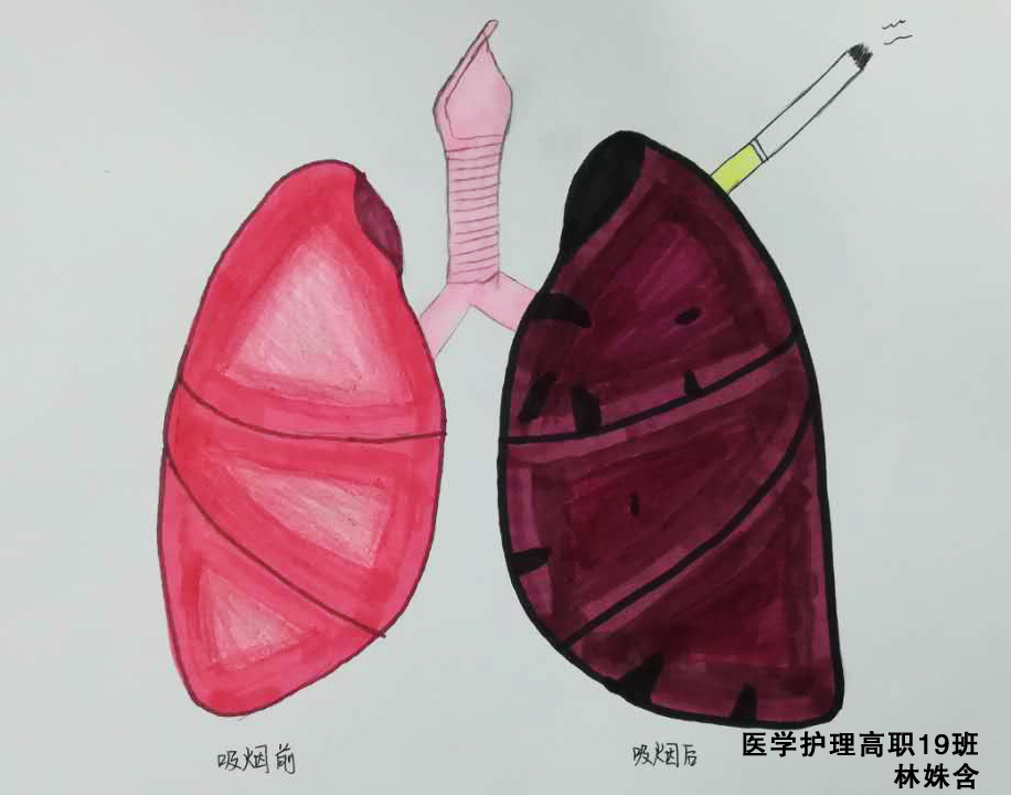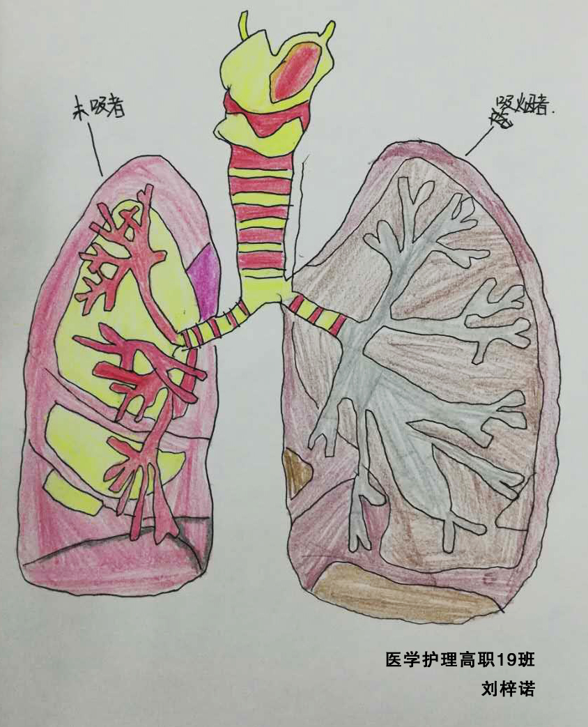 5月31日是世界第33个无烟日,为了科学引导青年学生树立拒绝传统烟草产品和电子烟的健康理念,保护青少年健康, 创造一个无烟的健康环境。在世界无烟日期期间,卫生健康学院开展了“世界无烟日——吸烟前后肺部解剖对比图”绘画比赛,同学们结合自己所学专业,用自己的画笔绘出一幅幅生动的肺部解剖图,经过专业老师认真评审,最终评出一等奖1名,二等奖2名以及三等奖3名。