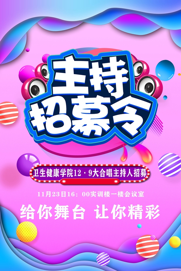 为配合卫生健康学院12·9大合唱比赛的顺利开展,丰富学生的校园生活、给同学们一个展示自己的舞台,我院团总支决定进行主持人选拔,现将相关事项通知如下: